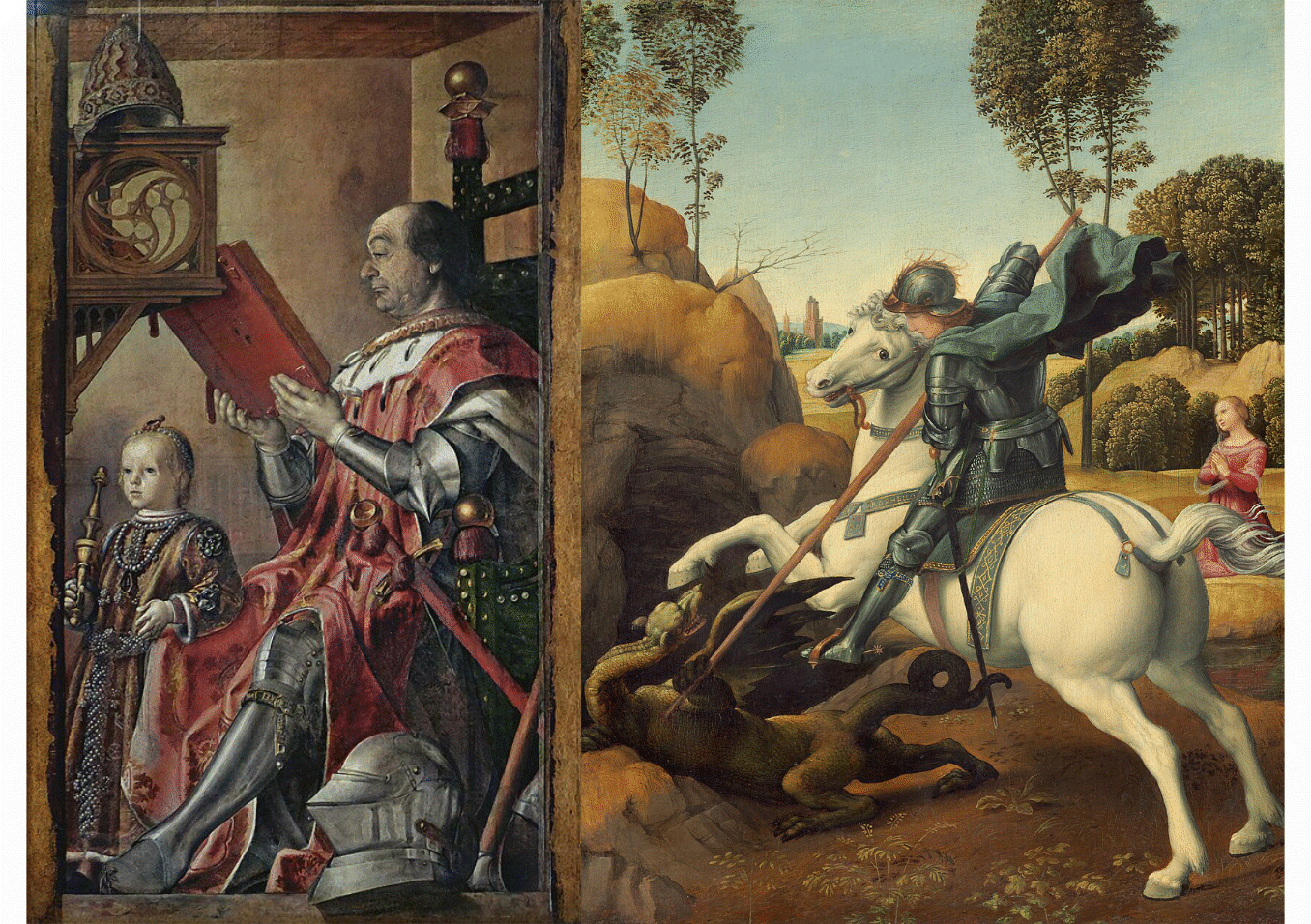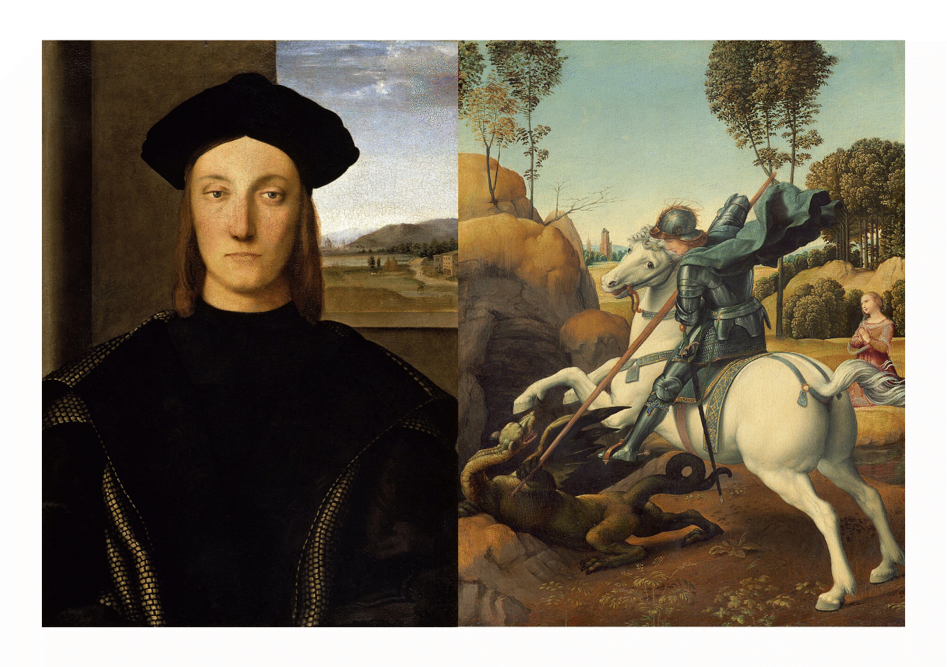 [T]here are several stylistic, figurative, and narrative differences between the two works, the most prominent of which is the blue garter around St. George's in the latter piece. Rafael's patron, the Duke of Urbino, was inducted into the Order of the Garter, and the commission of this painting was meant to honor that.